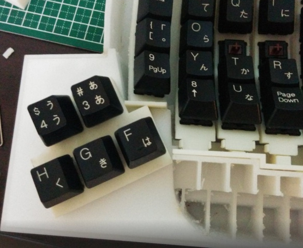 An early experimental 2 + 3 two-row thumb cluster, that we could easily move and rotate to explore the best position
